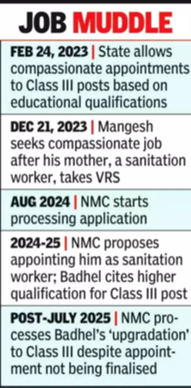 The controversy centers on Mangesh Badhel, a resident of Borkar Nagar on Ghat Road, who applied for a job on compassionate grounds after his mother, a sanitation worker with the civic body, opted for voluntary retirement. Initially, the NMC processed his appointment as a sanitation worker, following standard protocol. However, Badhel—who holds a BE and an MBA degree—declined this offer and instead sought a Class III position. He cited eligibility under a February 24, 2023 state government resolution that allows appointments based on educational qualifications, as per recommendations from the Lad-Page committee.