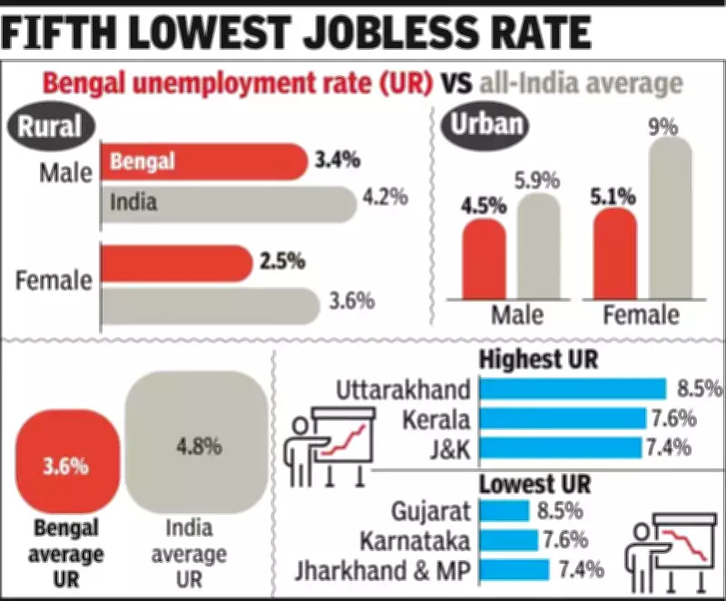 The survey reveals that only four states—Gujarat (2.3%), Karnataka (2.7%), Jharkhand, and Madhya Pradesh (both at 3.2%)—have lower unemployment rates than Bengal. The gap is particularly striking for urban females, where Bengal's unemployment rate stands at 5.1%, compared to the all-India average of 9%. This makes Bengal's urban female unemployment the third lowest nationally, trailing only Gujarat and Karnataka.