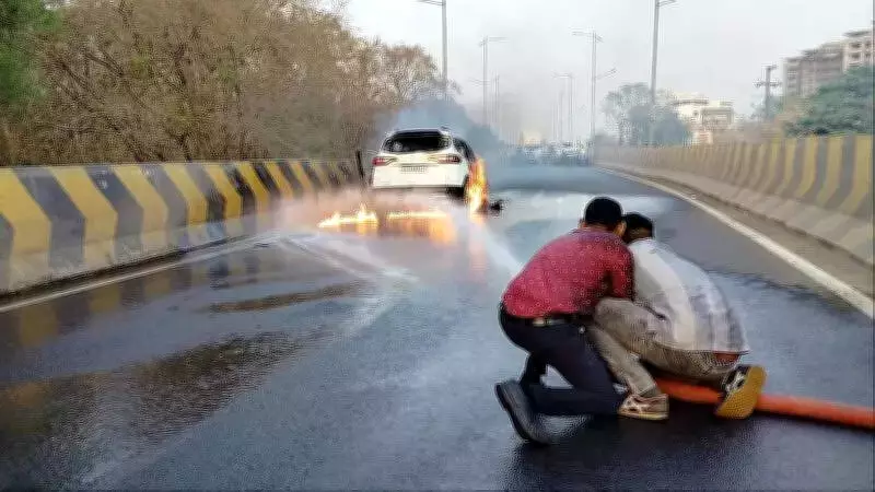 A vigilant four-wheeler driver in Akola demonstrated remarkable presence of mind by rescuing four occupants after their moving vehicle suddenly caught fire on the Sindhi Camp flyover. The incident, which occurred recently, highlights the importance of quick thinking in emergency situations.