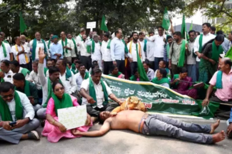 Meanwhile, near the regional commissioner's office, the protest escalated dramatically as members of the Kabini Raitha Hitha Rakshana Samiti staged a semi-nude demonstration to draw urgent attention to their grievances. In a powerful visual statement, they displayed an installation depicting a tiger attacking a farmer, symbolically representing the daily dangers faced by agricultural workers living along forest boundaries.