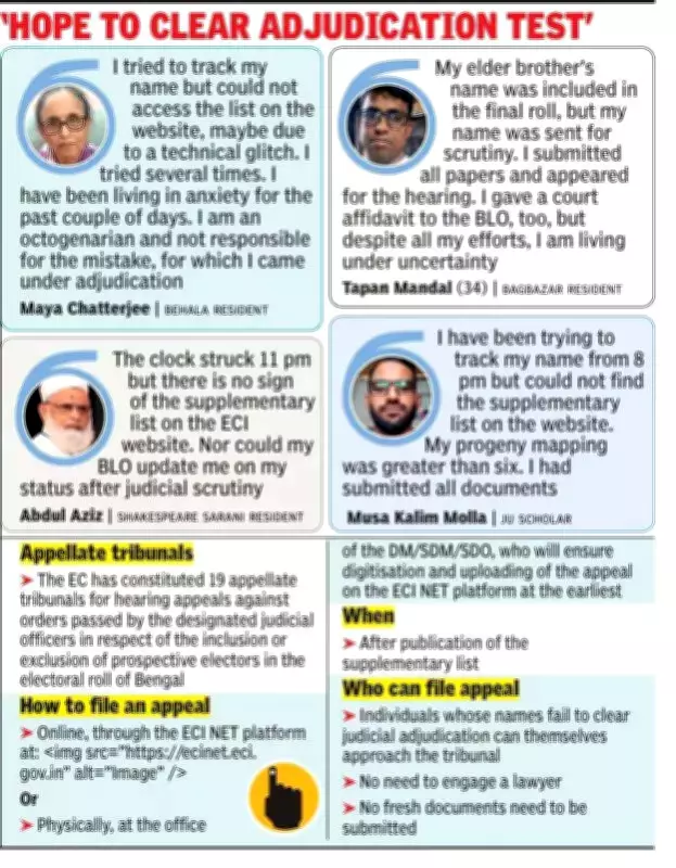 Maya Chatterjee, an octogenarian resident of Behala, expressed her distress after multiple failed attempts to check her status. "I have been living in anxiety for the past couple of days," she revealed. "I am not responsible for the mistake that placed me under adjudication, and during my hearing I presented all required documents to resolve the discrepancy. Yet I still cannot determine my voting status."
