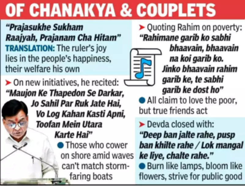 Commencing his budget address with profound references to Chanakya Niti, FM Devda intoned the timeless principle: "Prajasukhe Sukham Raajyah, Prajanam Cha Hitam" – emphasizing that the true joy of a ruler lies in the happiness of the people, and their welfare constitutes his own prosperity. This philosophical foundation set the tone for a budget presentation that sought to connect historical governance principles with contemporary development goals.