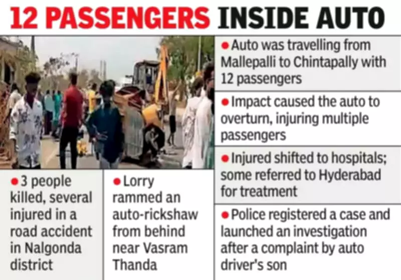 According to Nampally SI Linga Reddy, the auto-rickshaw was traveling from Mallepalli towards Chintapalli with twelve passengers on board. As the vehicle approached the stretch near Vasram Thanda, a lorry struck it from behind with significant force. The impact was severe enough to cause the auto to overturn, resulting in immediate casualties and injuries among the passengers.