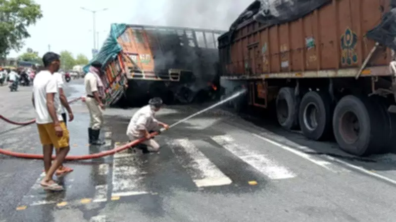 A serious accident occurred on National Highway 33 in Hazaribag district on Thursday when a 14-wheeler truck collided head-on with a trailer, resulting in a fire that engulfed both vehicles. The incident took place at Itkhori More in the Padma block area of the highway.