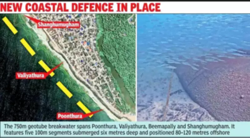 Implemented by the Kerala State Coastal Area Development Corporation (KSCADC) with technical support from NIOT and funding from the Kerala Infrastructure Investment Fund Board, the Rs 20 crore project aims to protect vulnerable stretches of the capital's coastline from persistent wave action. Launched in 2021 as a pilot, the project spans approximately 750 metres, covering areas including Poonthura, Valiyathura, Beemapally, and Shankhumukham.