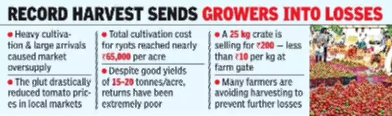 Large-scale cultivation efforts in the Chittoor and Madanapalle regions, combined with heavy arrivals from Krishna, NTR, Guntur, and West Godavari districts, have completely overwhelmed local market capacities. This sudden and unprecedented glut of tomatoes has pulled prices down to alarmingly low levels that fail to cover basic production expenses.