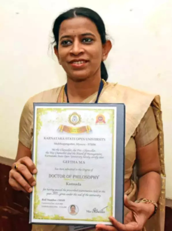 Geetha Prasanna received her PhD for a cultural study of the Mysuru district police. She credited her achievement to balancing professional duties with robust family support and expressed deep respect for the Kannada language and local culture, highlighting the integration of academic and professional pursuits.