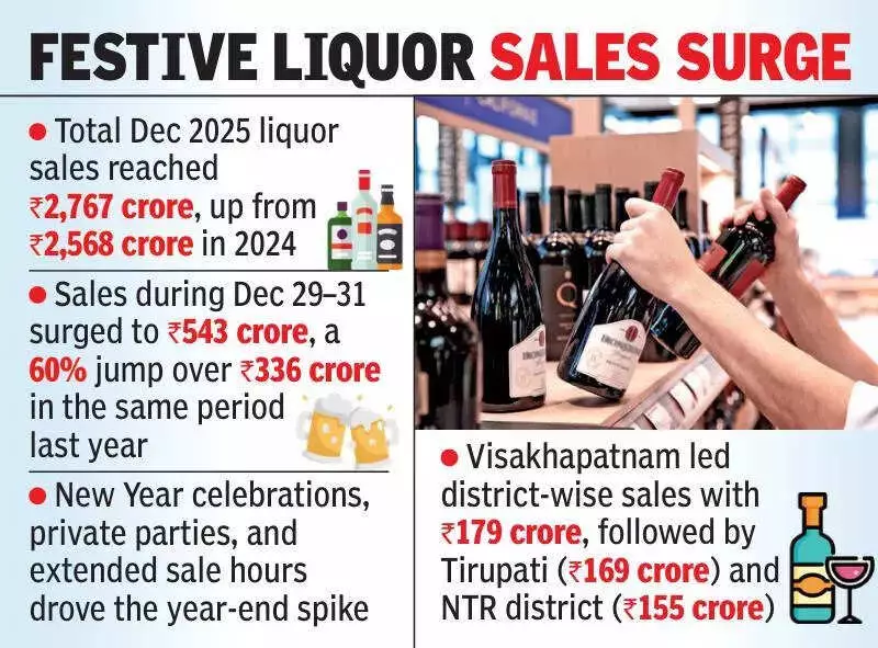 Liquor sales in Andhra Pradesh witnessed a significant uptick in December 2025, fueled by festive cheer and New Year celebrations, according to the latest official data. The state recorded an overall growth of nearly 8% in revenue compared to the same period the previous year.