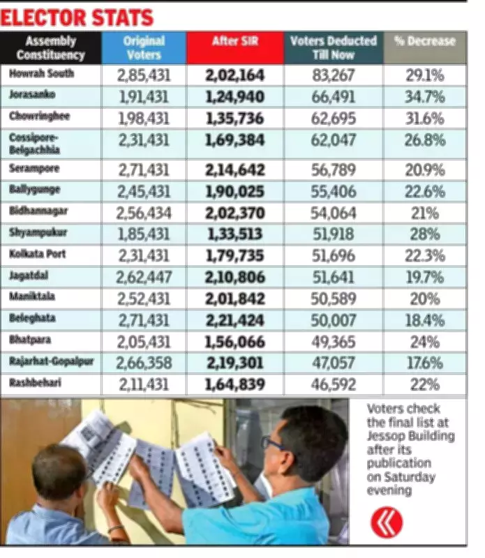 The 4-month-long SIR exercise also significantly affected other areas. For instance, Bidhannagar assembly constituency saw 54,064 electors wiped out from the roll, reducing its electoral base by 21% from an initial 256,434 voters. Other Kolkata assembly constituencies like Cossipore-Belgachhia, Ballygunge, Shyampukur, and Kolkata Port also secured places among the top 10 state-wide for voter depletion.