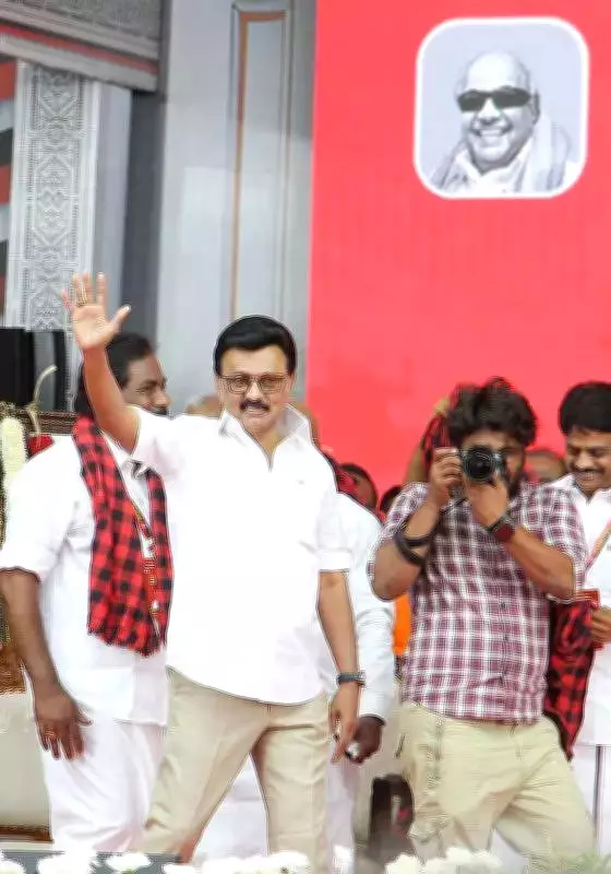 Earlier in the event, Stalin paid floral tributes to portraits of prominent leaders: Periyar, C N Annadurai, M Karunanidhi, and K Anbazhagan, honoring the party's legacy. Minister P Moorthy presented a sceptre (sengol) to Stalin, symbolizing authority and tradition.